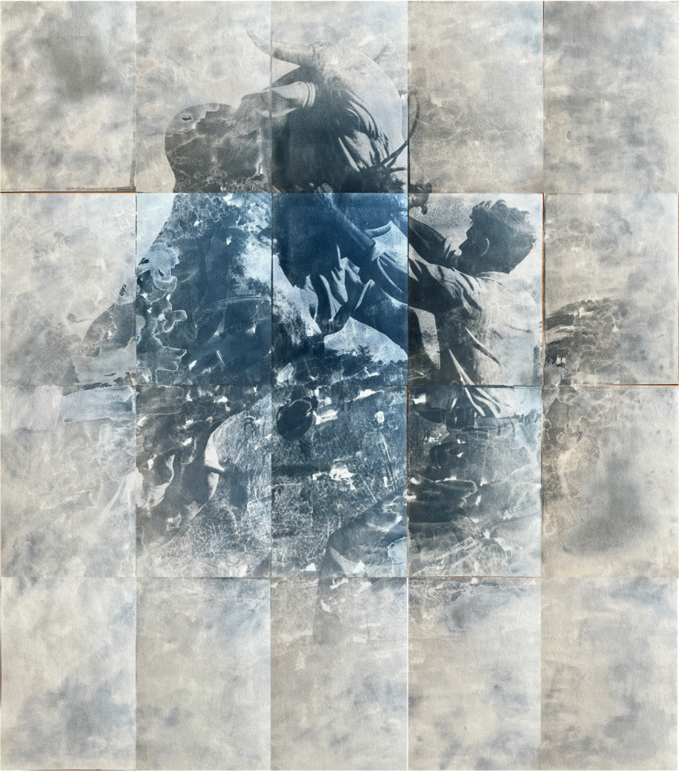“Não tenho medo de você” é composta por um mosaico de vinte cianotipias que, reunidas, formam a imagem de um homem e um boi em situação de confronto. O boi, erguido sobre as patas traseiras, avança contra o homem, que o segura pelo pescoço com as mãos. A densidade das texturas reforça o caráter visceral da cena, criando uma atmosfera carregada de tensão e intensidade. A obra joga com o paradoxo do medo, desafiando o espectador a refletir sobre quem teme quem; quem é o verdadeiro inimigo e o que resta quando o confronto é inevitável - quando a fúria é a única resposta possível.